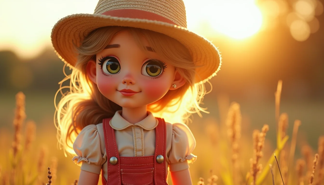 Pintura em guache de uma boneca caipira em um campo de girassóis, com vestido amarelo e detalhes em marrom, iluminação suave de fim de tarde.