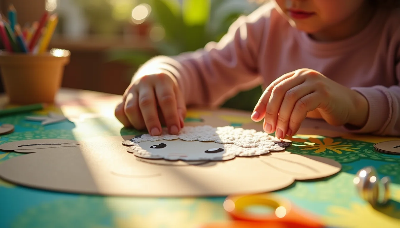 O contraste entre a lã branca e o focinho rosado cria um ponto focal que atrai o olhar infantil.