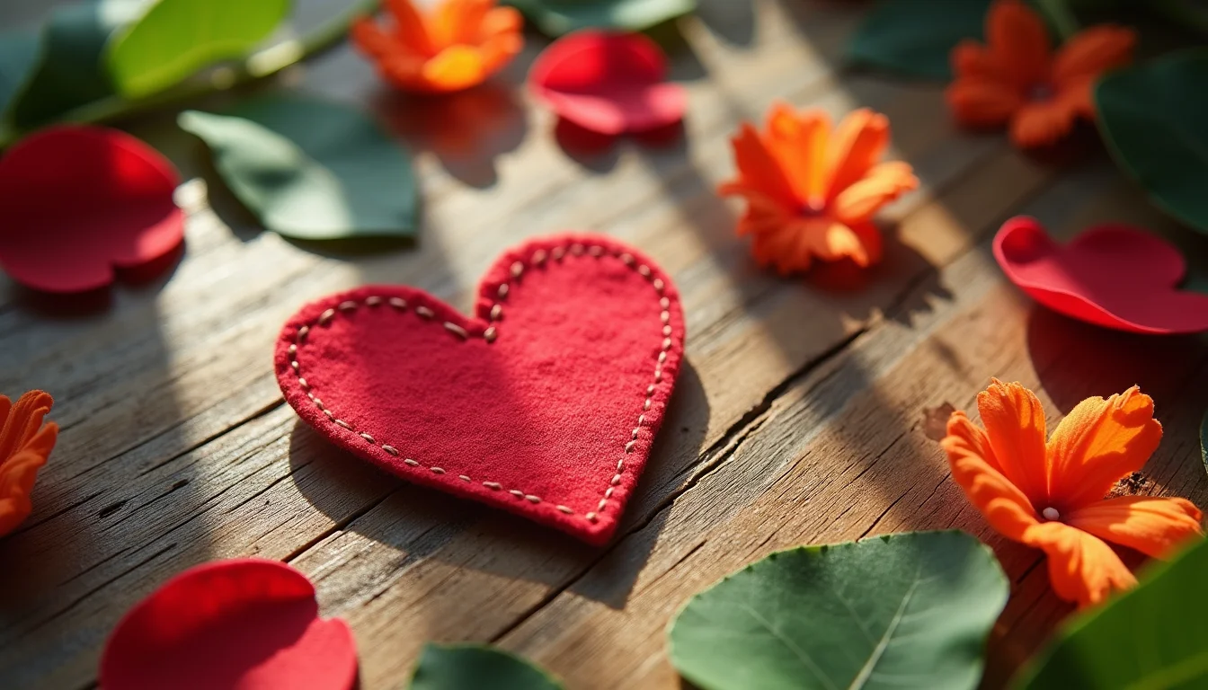 Corações em feltro vermelho vibrante criam contraste sobre madeira clara. A textura aveludada convida ao toque.