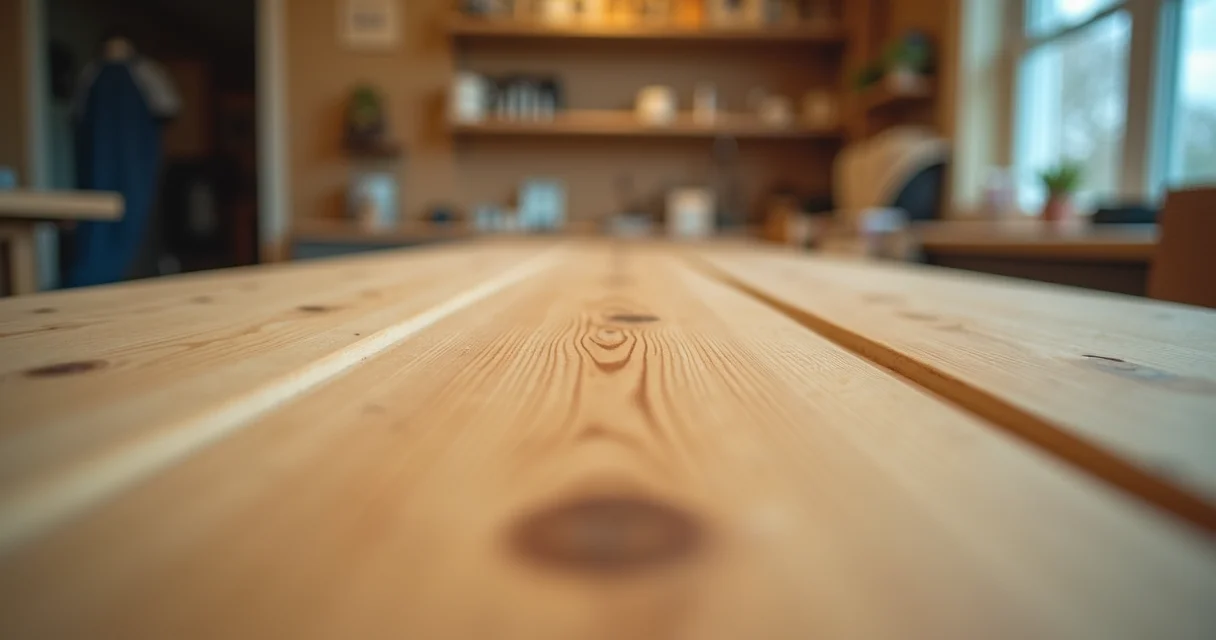 Superfície de mesa de jantar em madeira maciça lixada, mostrando a granulação fina da madeira antes da aplicação do verniz, com foco na textura uniforme.