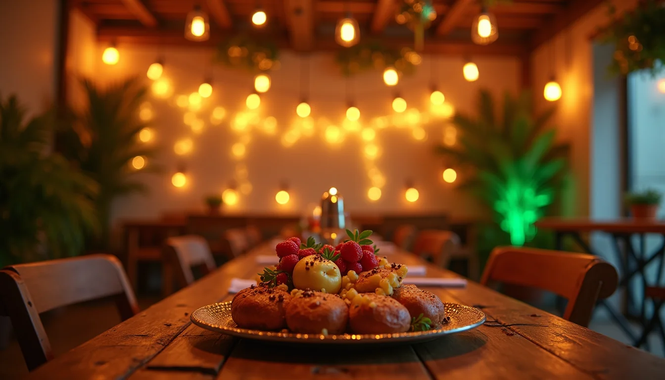 A iluminação estratégica com cordões de luzes cria um ambiente mágico, transformando um espaço simples em um cenário encantador.