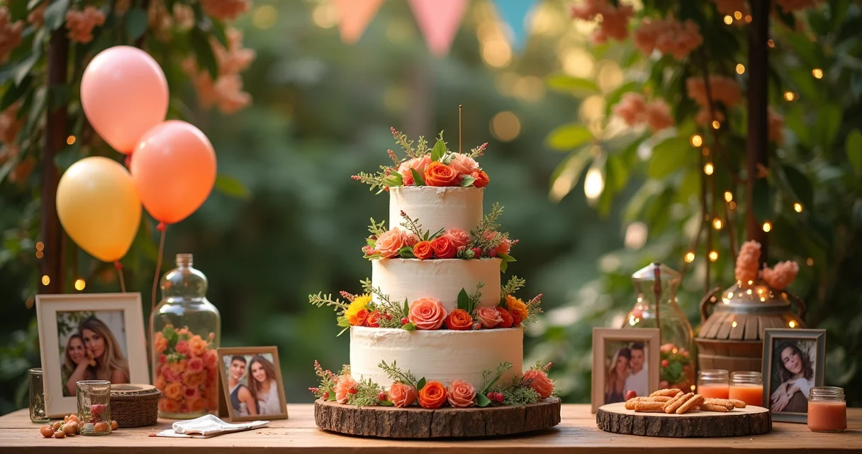 Em Destaque 2026: A decoração de noivado simples deve priorizar um ambiente acolhedor e romântico, focando na mesa do bolo e em elementos afetivos como fotos do casal, utilizando materiais acessíveis como flores naturais, balões e madeira.