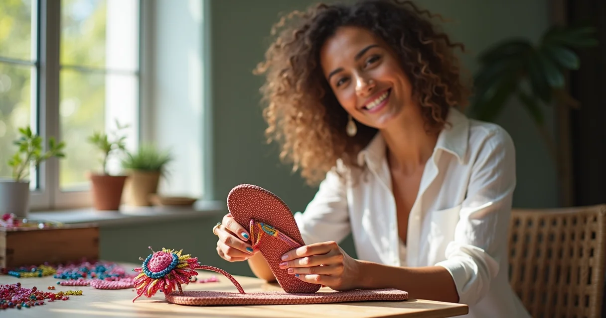O movimento DIY (Do It Yourself) é perfeito para customizar chinelos com miçangas. Além das pérolas, você pode usar miçangas de vidro, cristais e até strass para um brilho extra. O passo a passo é sempre o mesmo: montar a flor, garantir a firmeza com o fio de nylon 0.40mm e costurar com precisão na correia. Lembre-se que um bom planejamento dos materiais antes de começar evita interrupções e frustrações.
