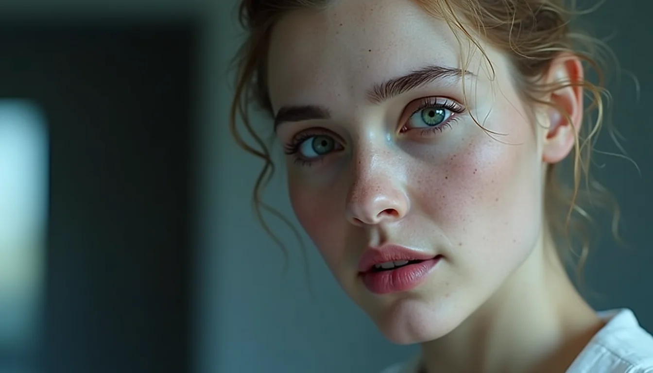 Um molde de silicone translúcido em formato de rosto humano, com detalhes finos de olhos, nariz e boca, em uma bancada de madeira clara.