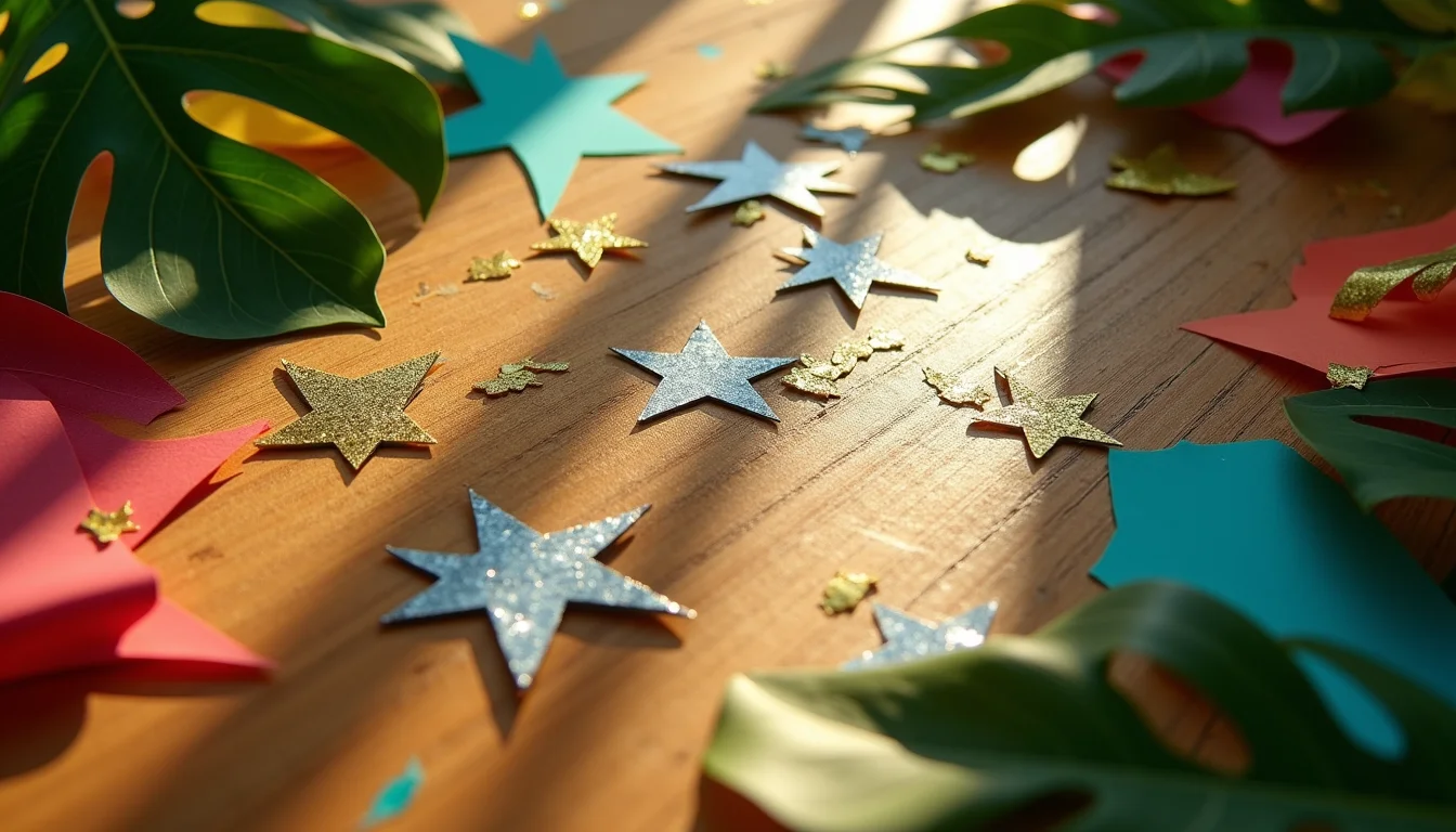 Estrelas de cinco pontas funcionam como âncoras visuais em qualquer composição. Use papéis metalizados para capturar a luz natural.